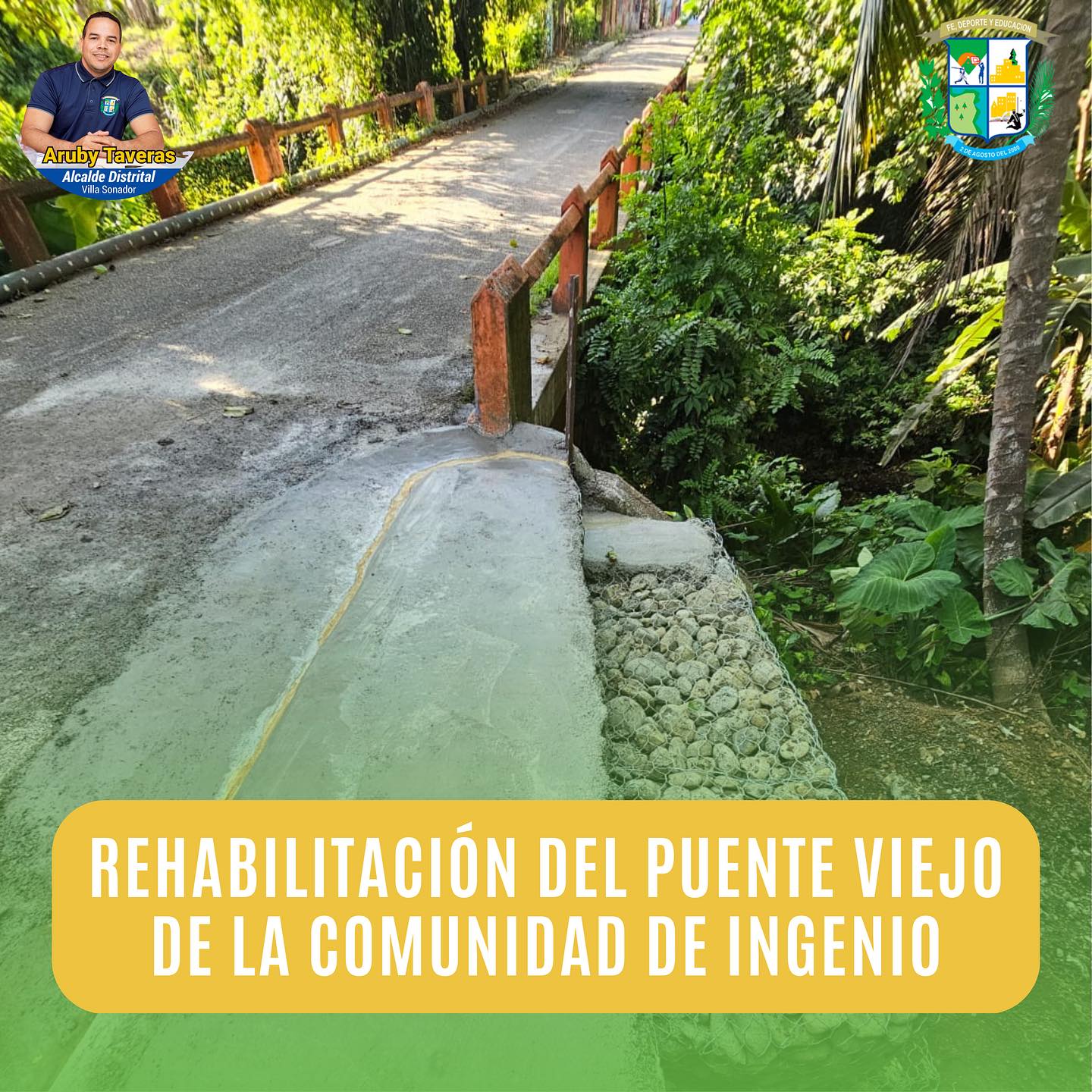 Rehabilitación del puente viejo de la comunidad de INGENIO, en este proceso colocamos un gabión y hormigón armado diseñado para amortizar la caída del agua y así garantizar su calidad y durabilidad en el tiempo.